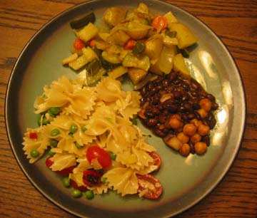 With the children learning the basic tools and getting the idea that the best food processing happens at home, we are ready to discover what tasty things we can concoct from the edges of the store. We all love salad. We make a big bowl of it nearly every night for dinner. Each of us eats a whole plateful before moving on to the main course. The romaine salad with tomatoes and peppers is a standard, garnished with some small cubes of cheese. We don't do iceberg lettuce, because it's one of the 'white foods'--"The whiter the food, the sooner you're dead!" (more on this later). In the summer when fresh veggies are bursting out all over, we make a salad of sliced tomatoes, cucumbers, and onions, with a Greek dressing. It goes fast.